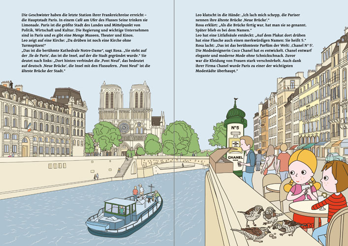 „Lässt sich ein 9-Gänge-Menü in einem großen Topf kochen?“ Diese Frage führt Leo und Rosa ins Land der Kochkunst – nach Frankreich. Sie baden in 3 Meeren, reisen um 6 Ecken, verspeisen 9 Gänge und erleben dabei Land und Leute: Leo und Rosa betrachten Tierbilder aus der Steinzeit, baden unter einer römischen Wasserleitung, besteigen den Montblanc, schippern über den Canal du Midi, reisen auf der Wanderdüne von Pilat, fahren Ballon in Versailles und erleben das Finale der Tour de France in Paris. Rosa erzählt ihrem Bruder eine Menge über Städte und Sehenswürdigkeiten, doch Leo erkundet die Dinge lieber auf eigene Faust ...